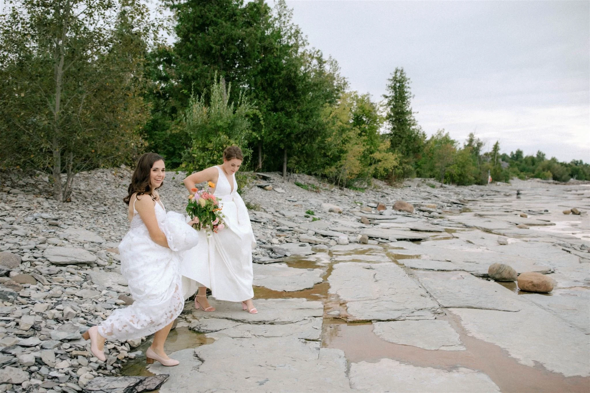 Everyone clambered onto the bus that took them to Georgian Peaks Ski Club. The place was beautifully decorated with floral arrangements by Ashley Elaine Florals. They had their wedding ceremony outside at the base of the slopes and were married by one of their closest friends. After saying their vows in front of their loved ones, they shared a champagne toast. We dashed across the road to Delphi Point for a few couple’s portraits at golden hour. Then everyone celebrated together at Georgian Peaks with delicious food catered by Men With Knives and an elegant three-tier cake made by Heather’s Aunt Karen. It wasn’t long before the shotski came out and an epic dance party ensued. It was such an honour to be part of Heather and Alyssa’s much anticipated wedding. Below are some of my favourite moments from the day.