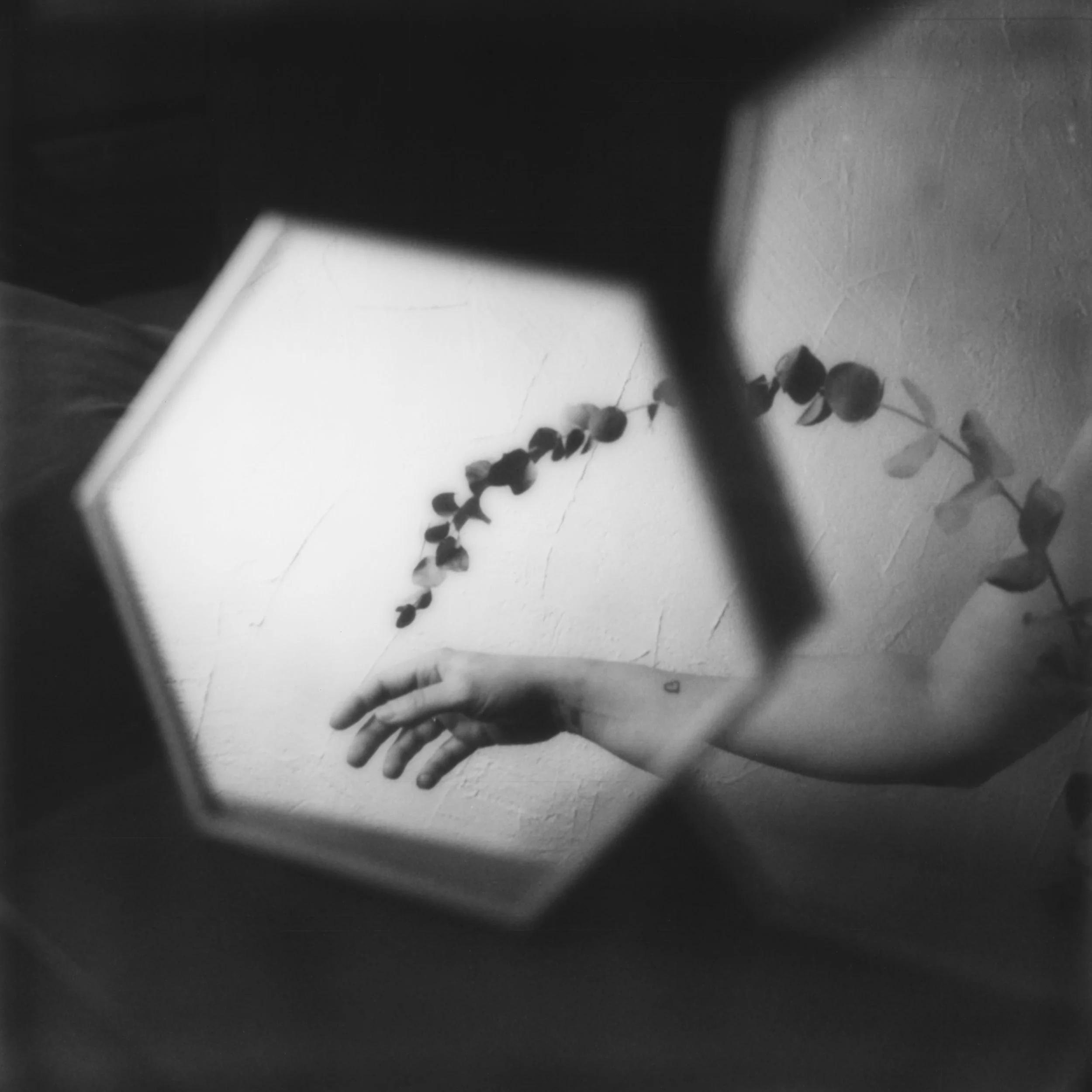 Black and white image of a person’s arm and hand reflected in a hexagonal mirror, with eucalyptus leaves in the background.