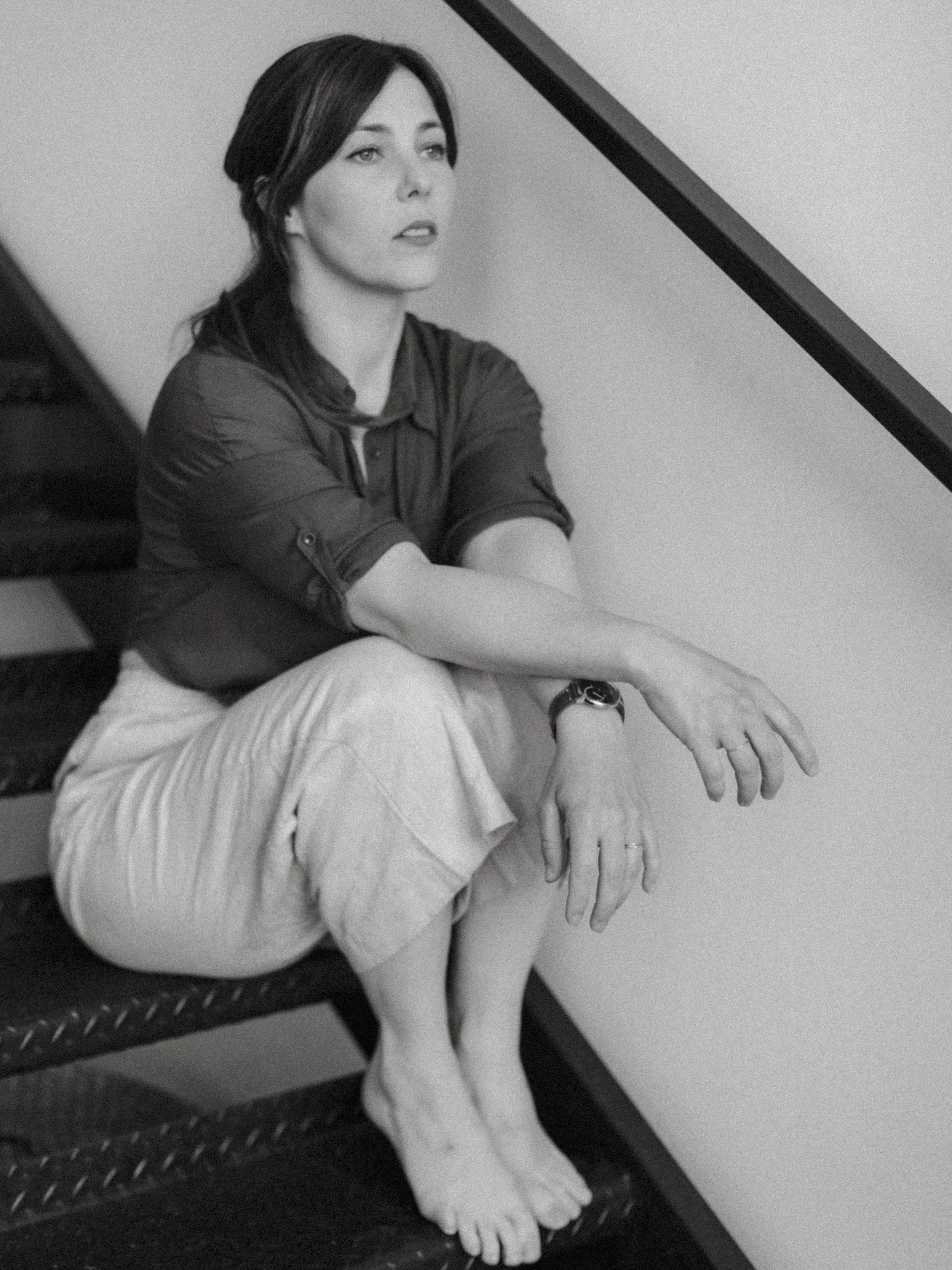 Black and white photo of a woman sitting on stairs, barefoot, wearing a shirt and light-colored pants, looking thoughtful.