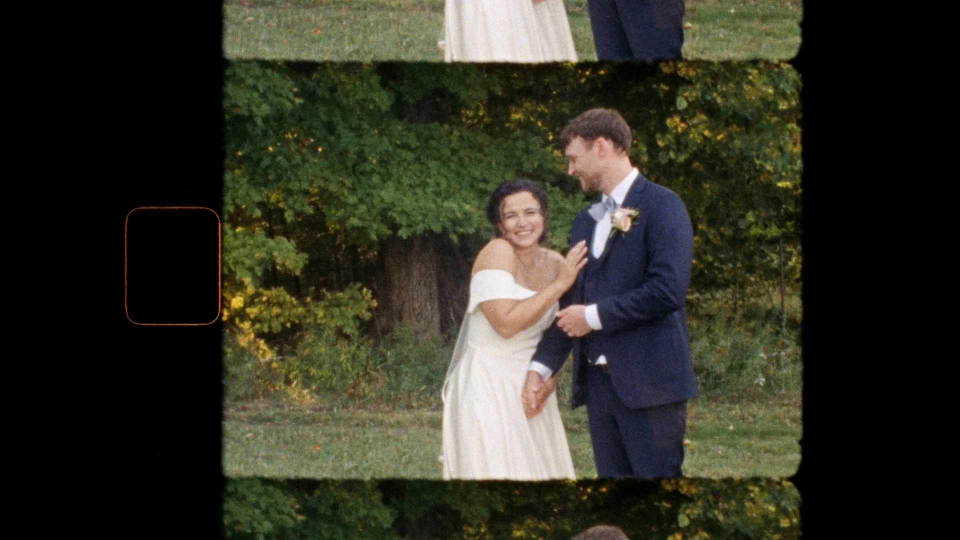 • A bride and groom standing outdoors, with the bride in a white dress and the groom in a dark suit, both smiling, surrounded by greenery shot on 8mm film.