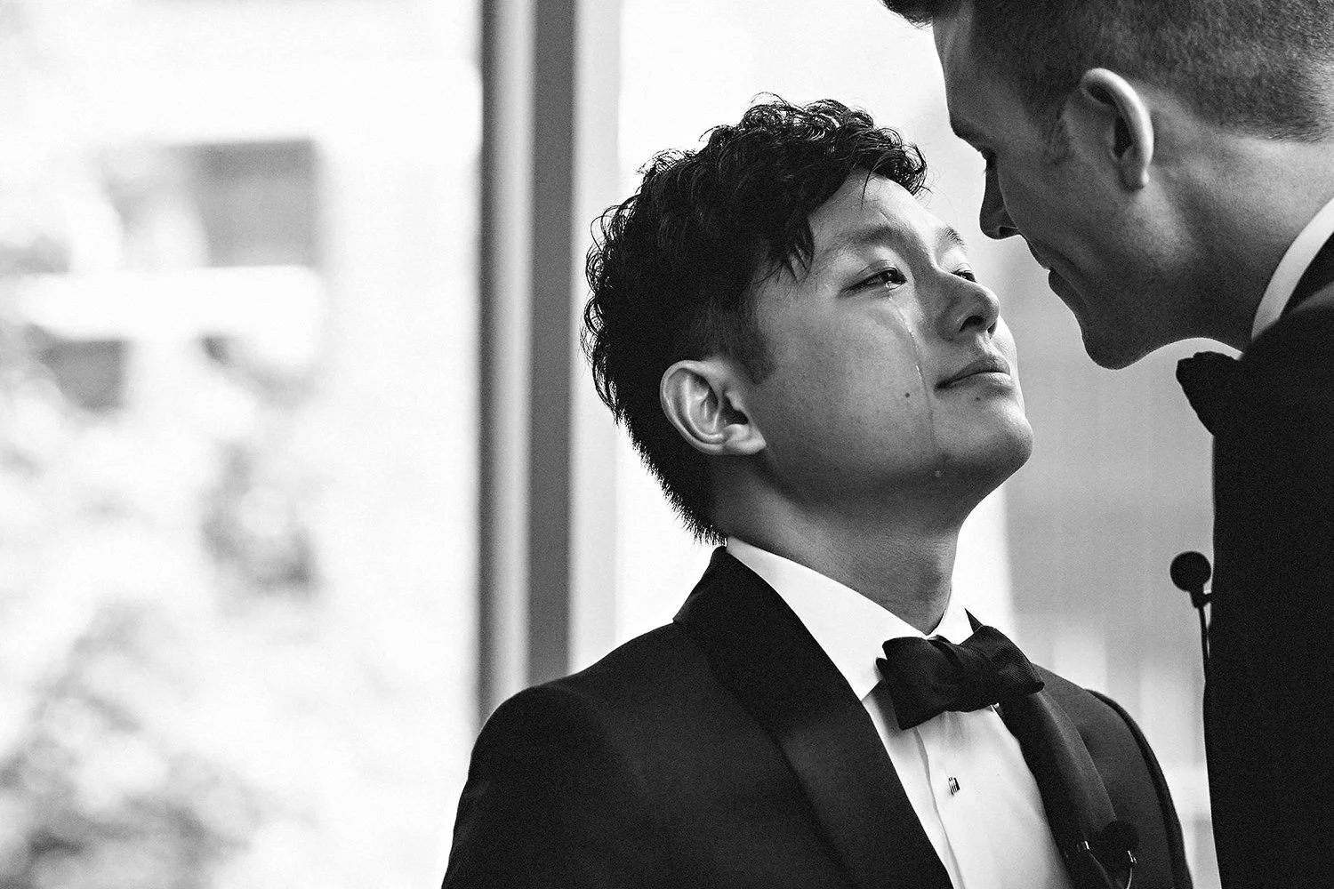 Two grooms in suits, one with a tear, standing closely, about to kiss during a first look.